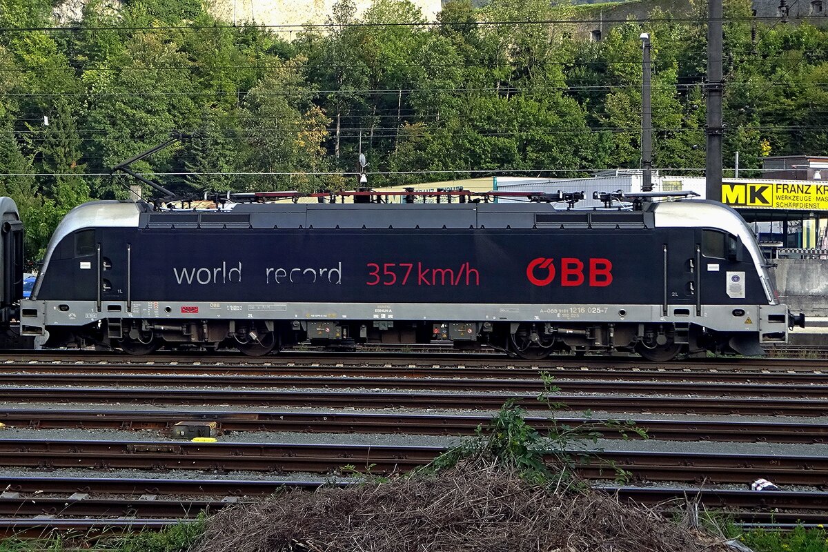 Side view on the fastest locomotive in the world 1216 025. Her commemmorsating stickers although are beginning to wear out whilst departing from Kufstein on 17 September 2019. A stop of five minutes at Kufstein enables two shots of this loco. One from the pedestrians'bridge and this one. Leonardus Schrijvers