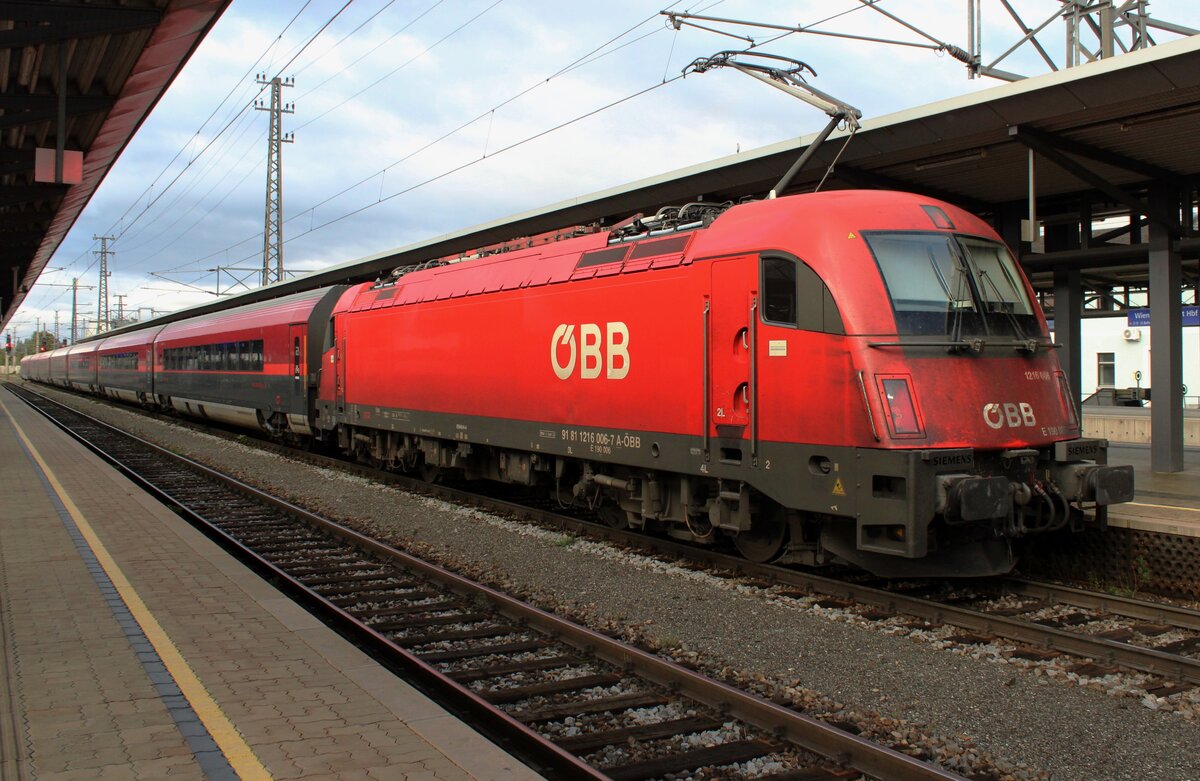 The last train from Wiener Neustadt to Vienna on 15 September 2024 was this RailJet with mundane red 1216 006 pushing. From 14;00 that day, massive flods took out all railway lines to and from Vienna. Having arrived with 40 minutes delay from Murzzuschlag, this train will leave Wiener Neustadt with an extra hour delay whilst getting completely overcrowded. Next day, storm BORIS took out almost the entire Austrian railway network, sparing only the Tyrol. Leonardus Schrijvers