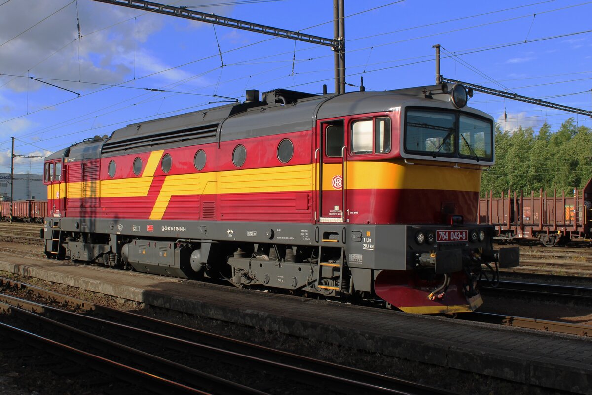 On 29 May 2025 CD 754 043 stands at Jihlava, carrying a colour scheme that was used mostly on CSD/ZSSK Class 742 Diesel shunting locomotives.