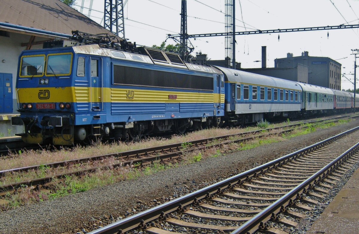 Evening fals upon Praha-Masarykovo and CD 362 078 on 24 May 2015. Before the rise of the all-covering Najbrt colour schemes, CZech railways were rather colourfull. Electric locos had a colour scheme based on their traction with green for 3,000 Volt DC, red for 25 kV 50Hz AC and blue for dual system locos -with waist bands varying in colours from light b eige and ivory to desert and dark yelow.