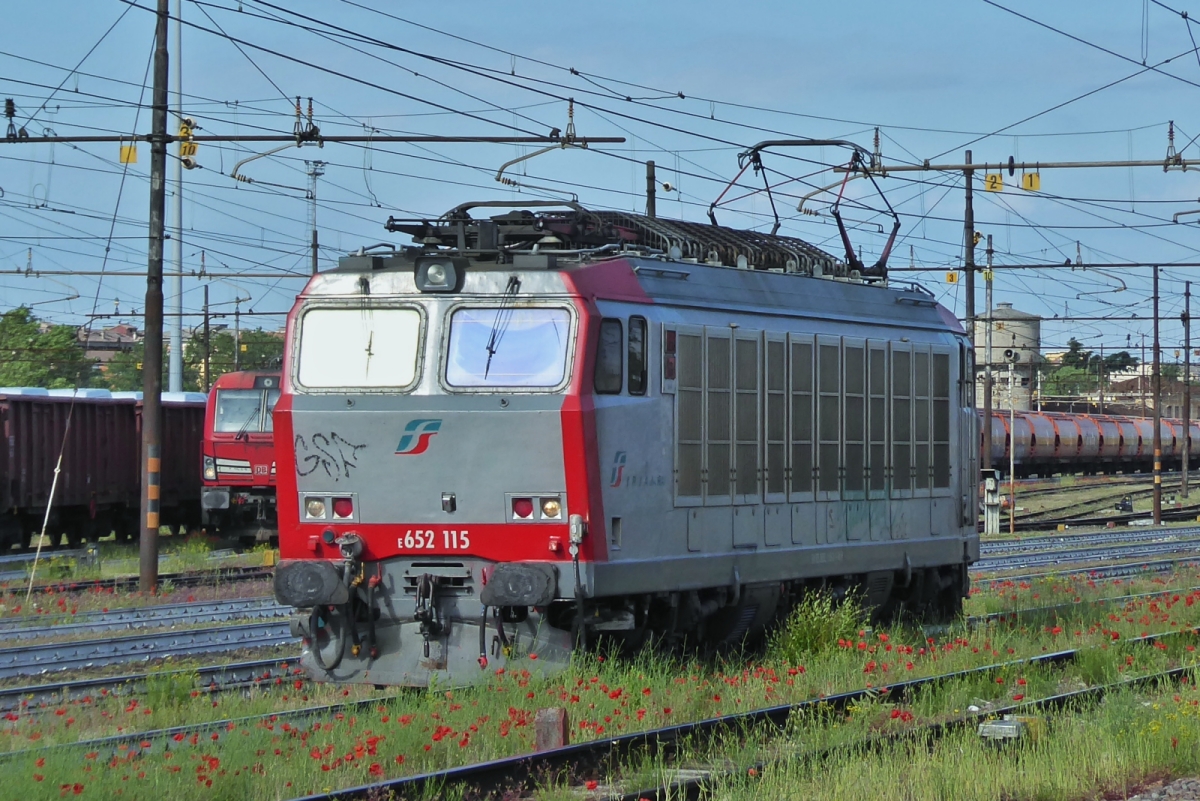 Locomotive E 652 115 is driving through the freight area of the station Verona Porta Nuova. May 9th, 2025