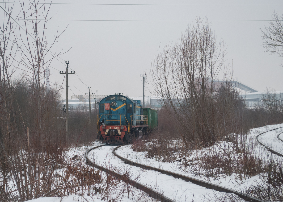 TEM1-1769 diesel locomotive, manufactured in 1967. It belongs to LLC UVTK Ternopilbud. It is currently out of service. Taken on January 25, 2022 on the railway siding to Ternopilbud.