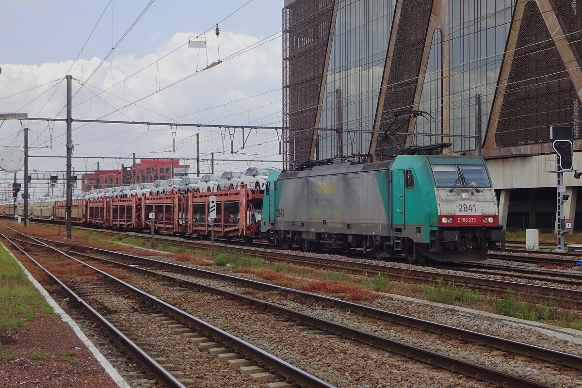 Lineas 2841  e-drivers  hauls an automotive train through Hasselt toward Aachen West on 22 May 2019.