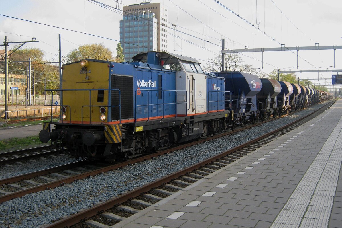 On 11 November 2012 Volker Rail 203-4 hauls a sand train through Utrecht Centraal.