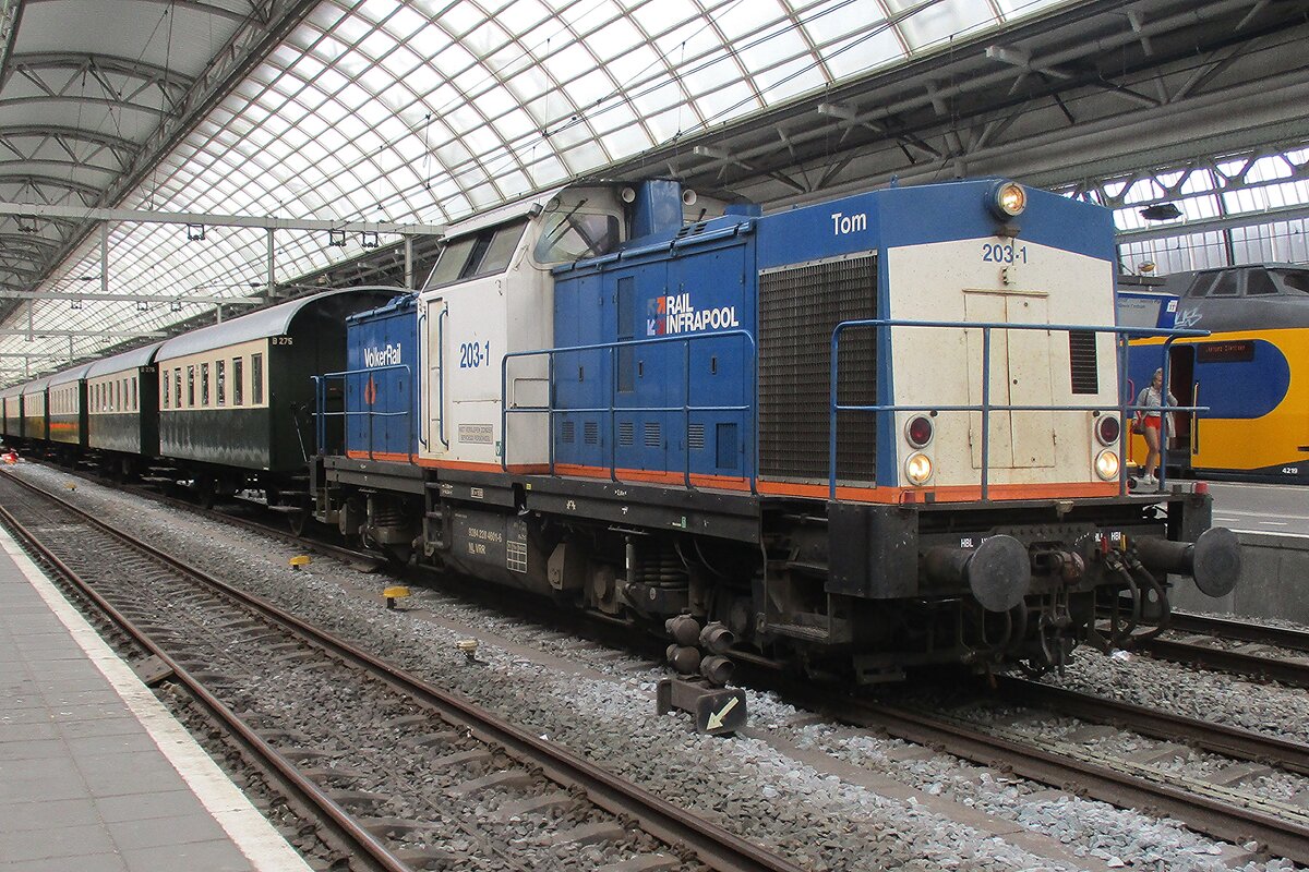 Surprise transfer of VSM coaches on 8 July 2018 at Amsterdam Centraal with Volker Rail 203-1 providing traction.