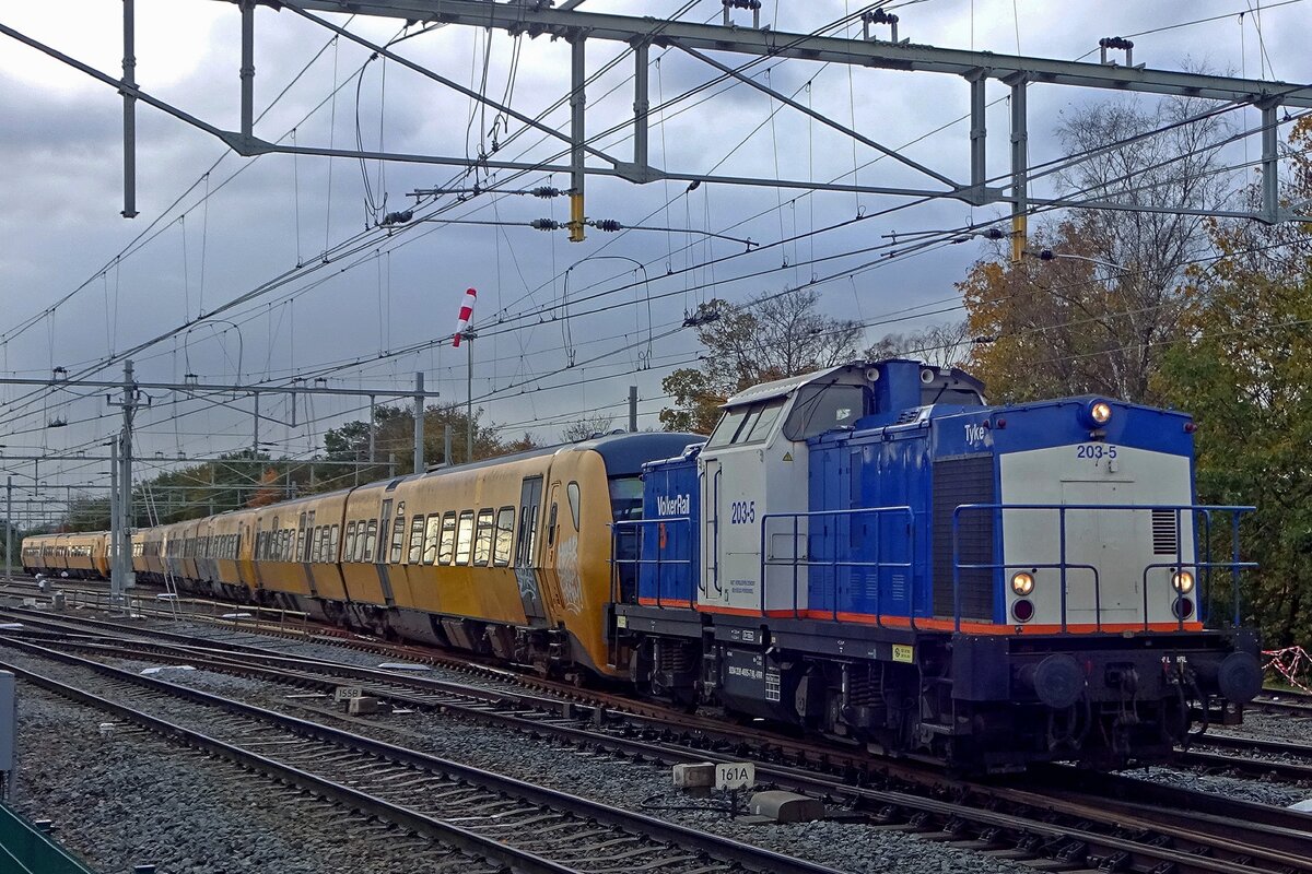 The Saga ends. Decommissioned NS DM'90s BUFFEL DMUs stood from 2016 at Nijmegen for a possible sale to a Romanian operator. Unclearities in -amongst others- obligatory documentations however ended the sale in 2019. Since Prorail and Nijmegen wanted the area, where 48 BUFFELs were stored, to be cleared up for building an extra platform at Nijmegen, the sale fell through and NS bought the BUFFELs back to get them to the scrapyard. On 13 November 2019 Volker Rail 203-5 hauls the first batch of DM'90 out of Nijmegen. THe saga continues however with Polish operator SKPL buying the entire batch for deployment in services in the Slask and Dolnislask regions.