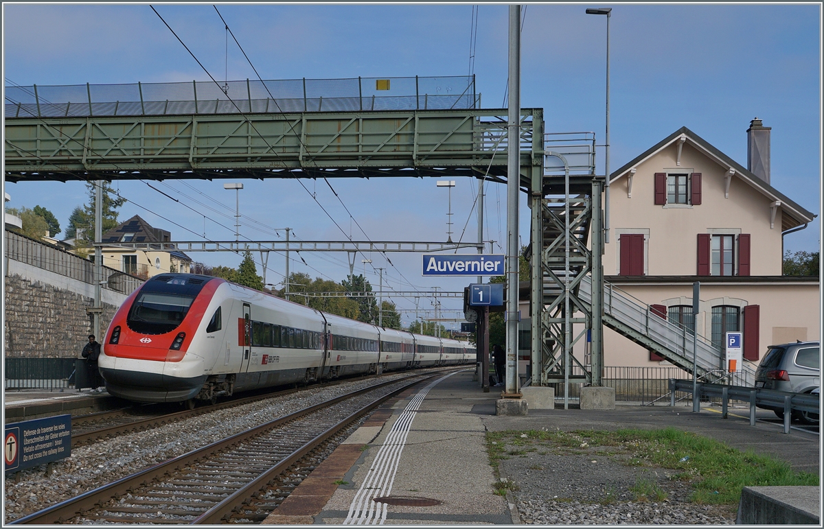 Two SBB RABDe 500 trains are operating as IC 5 by Auvernier on the way to Lausanne.