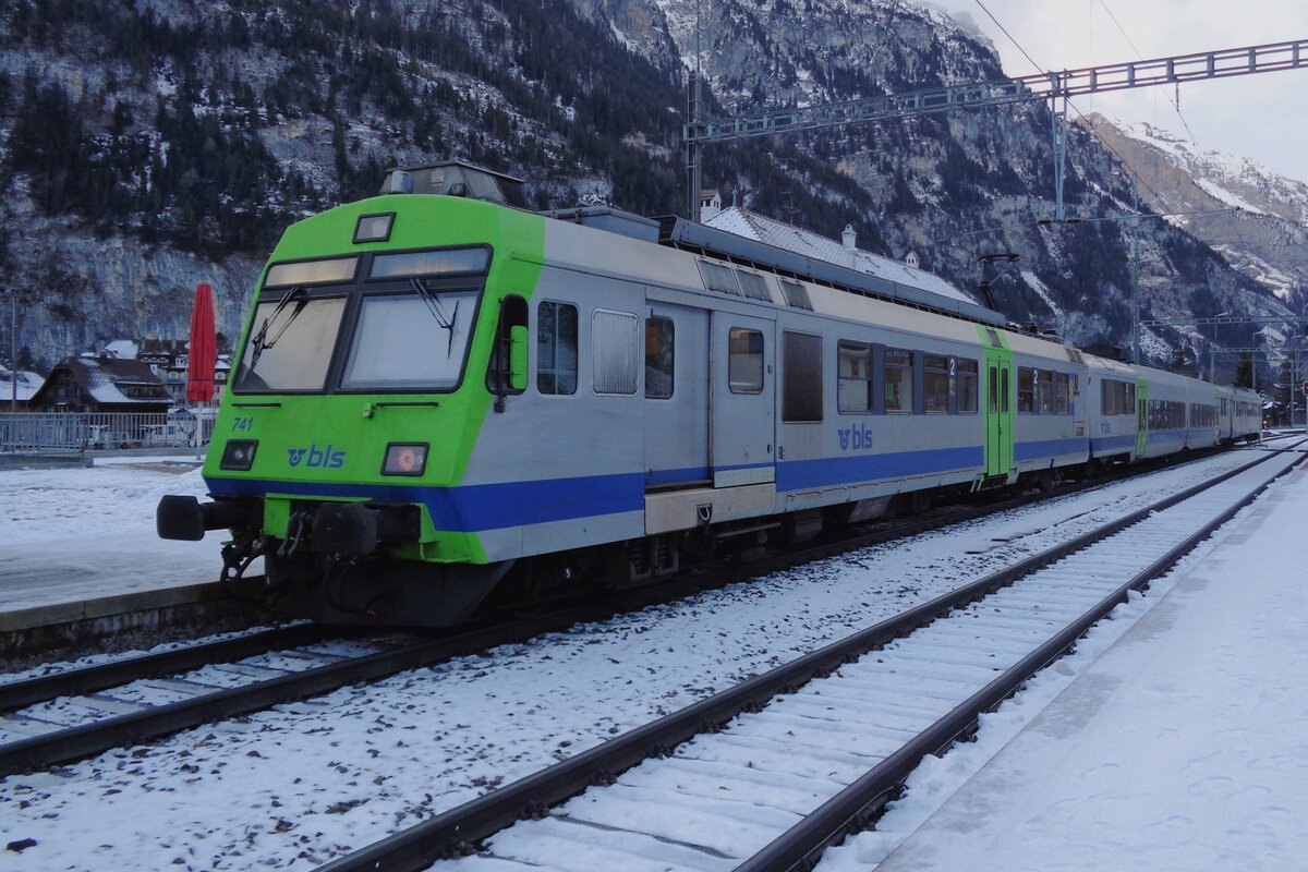 BLS 741 stands in Kandersteg on 31 December 2018 -despite it being about Noon, the photo is rather dark due to the fact, that Kandersteg station lies almost entirely in the shadows of the adjacent Alps.