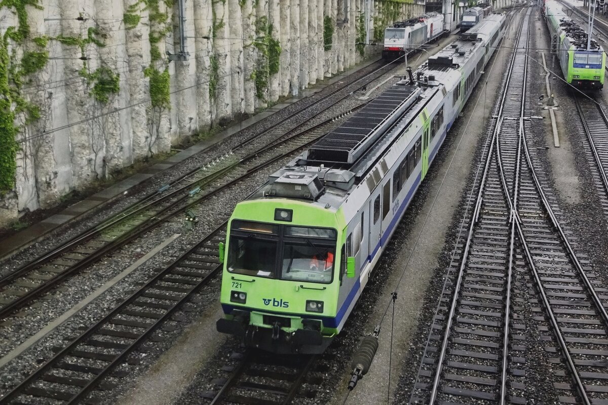 Top shot on BLS 721 at Spiez, seen from the station's pedestrian bridge on a rainy 28 May 2019.