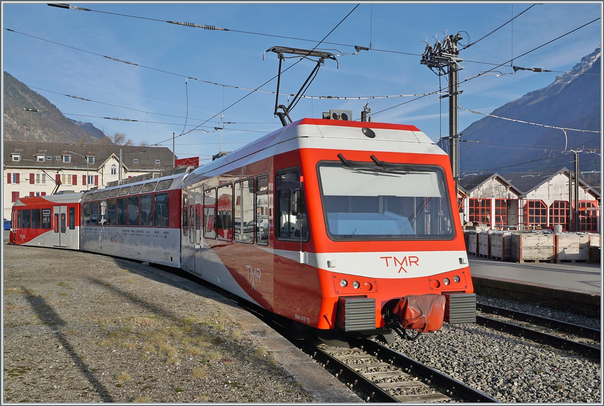 The TMR BDeh 4/8 21 (UIC 90 85 838 0872-4 CH-TMRSA) as local train service is on the way from Vallorcine to Vernayaz and is arriving at the Finhaut Station.