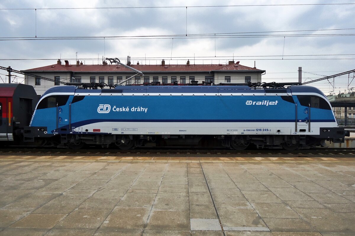 SPIRIT OF BRNO in Brno hl.n.: 1216 235 (called SPIRIT OF BRNO) pushes a RailJet towards Praha out of Brno hl.n. on 19 September 2024. Leonardus Schrijvers
