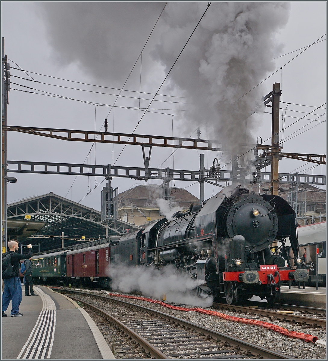 As every year, the popular steam train tour with the "Train Casse" took place this year. In addition to the ride, the culinary part also contributed greatly to its success. The impressive train consists of 40 axles and departs Lausanne station with the (ex) SNCF 141 R 568 at the head of the train.