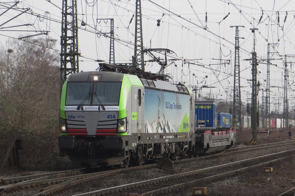 On 9 February 2023 BLS Cargo 475 414 hauls a trailer train out of Emmerich into the Netherlands.