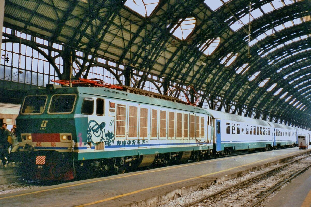 A bit tagged with experimental colours: FS E 632 063 stands at Milano Centrale on 20 June 2001.