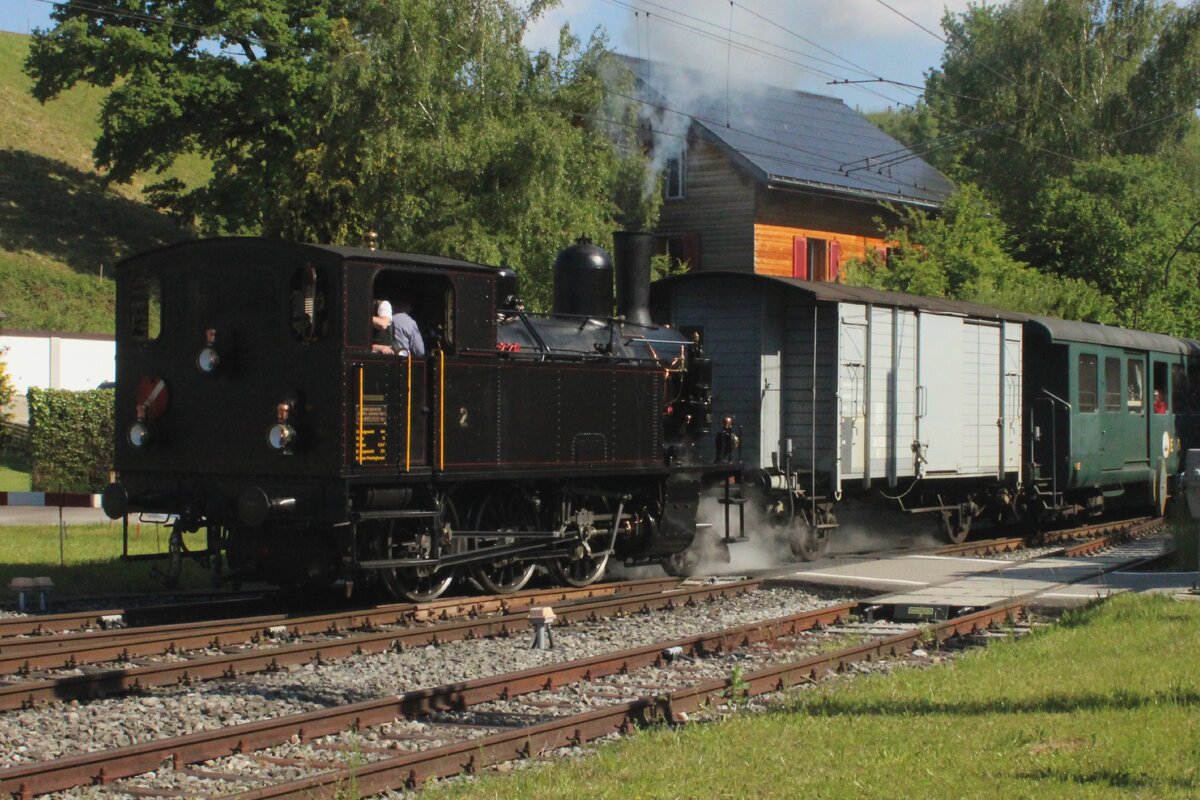 EBT-2 of the Dampfbahn Zürich enters Sümiswald-Grünen with an extra train on 18 May 2025 during the "150 Years of the Emmentalbahn" jubilations.