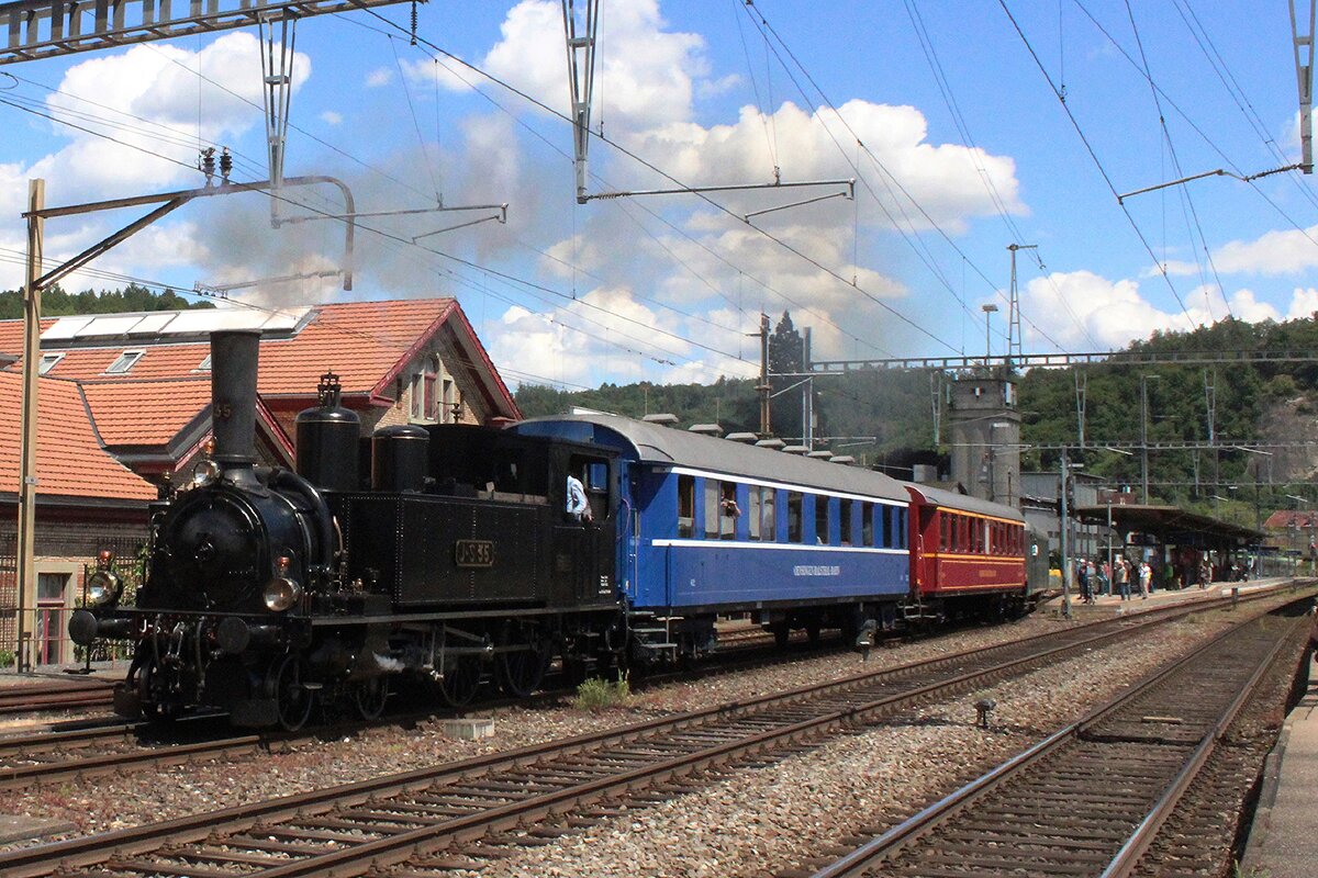 The traditional Gotthelf Market takes place in Sumiswald, and for this market, the Emmental Railway runs several steam trains on the Sumiswald Grünen - Wasen i.E. line. The photo shows the E 3/3 853 of the Dampfbahn Bern association entering Sumiswald Grünen. The steam locomotive was built in Winterthur in 1890 under the factory number 629 and delivered to the J-S (Jura Simplon Railway) as the F3 853. At the SBB, the E 3/3 series shunting locomotives with the running numbers 851 - 853 were assigned to Group 82 and given the numbers 8571 - 8576. In 1911, the E 3/3 853 locomotive received a new boiler and was sold to the RVT, where it remained in service until 1928, when it was used as an "industrial shunting locomotive" by Von Roll in Gerlafingen and Klus. When diesel locomotives made the steam locomotive obsolete, the Düby Foundation saved it from scrap by handing it over to the DBB (German Railways). After its overhaul in 1983, it entered service on the Sensetalbahn, among other routes. After another overhaul in 2021, the DBB E 3/3 853 was used primarily on the Emmentalbahn line from Sumiswald-Grünen to Wasen i.E. Today, the E 3/3 853 bears the UIC number 90 85 0008 573-7. June 14, 2025