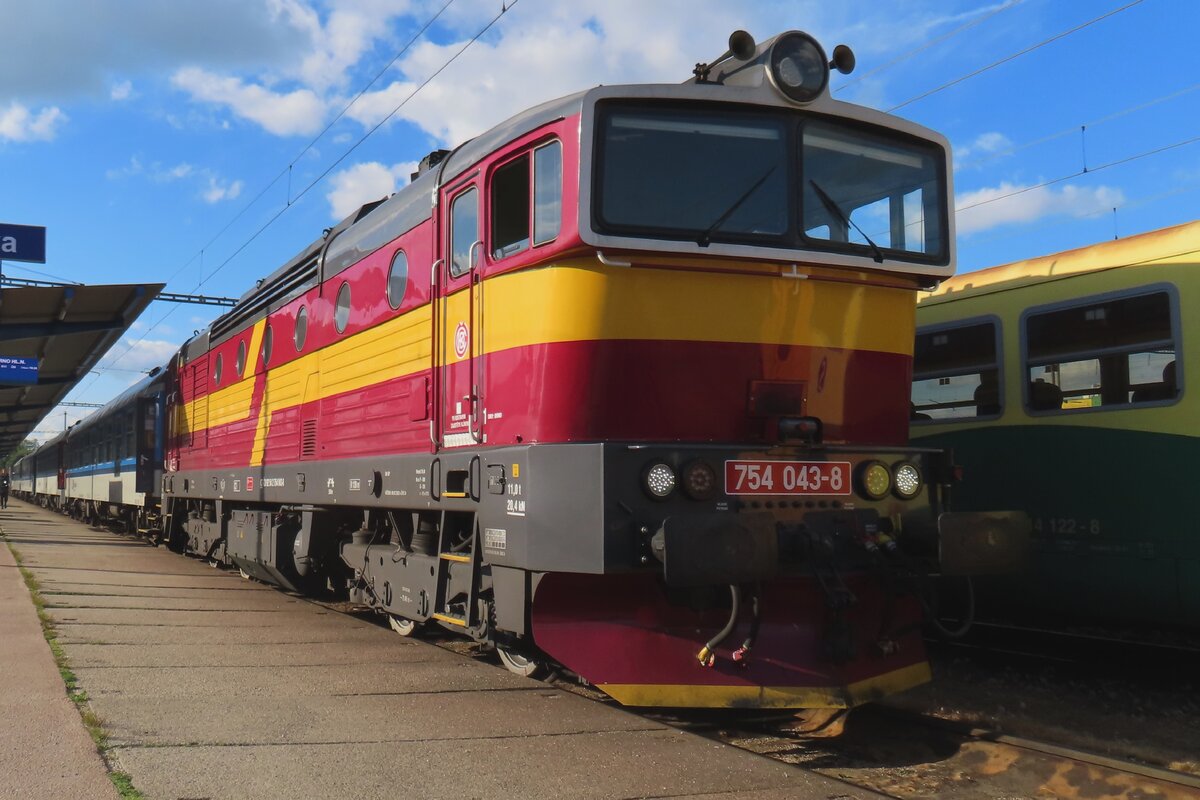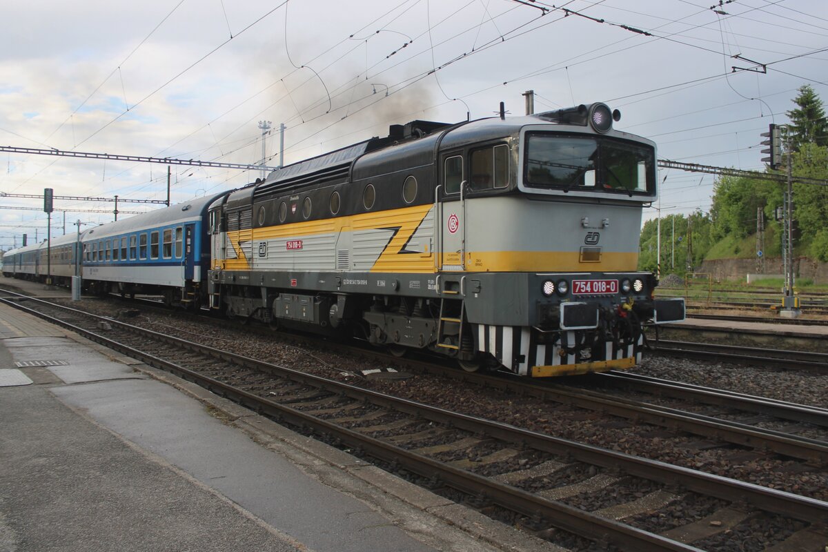 On 28 May 2025 CD 754 018 -carrying one of still rather many different colour schemes for Diesel locomotives- departs from Jihlava with a fast train to Brno hl.n.