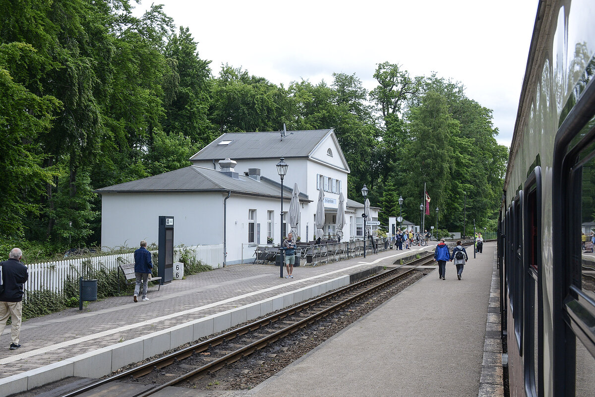 The white-painted station building in Heiligendamm on the narrow-gauge railway line between Kühlungsborn and Bad Doberan in the northern German state of Mecklenburg-Vorpommern. Date: 8th June 2025.