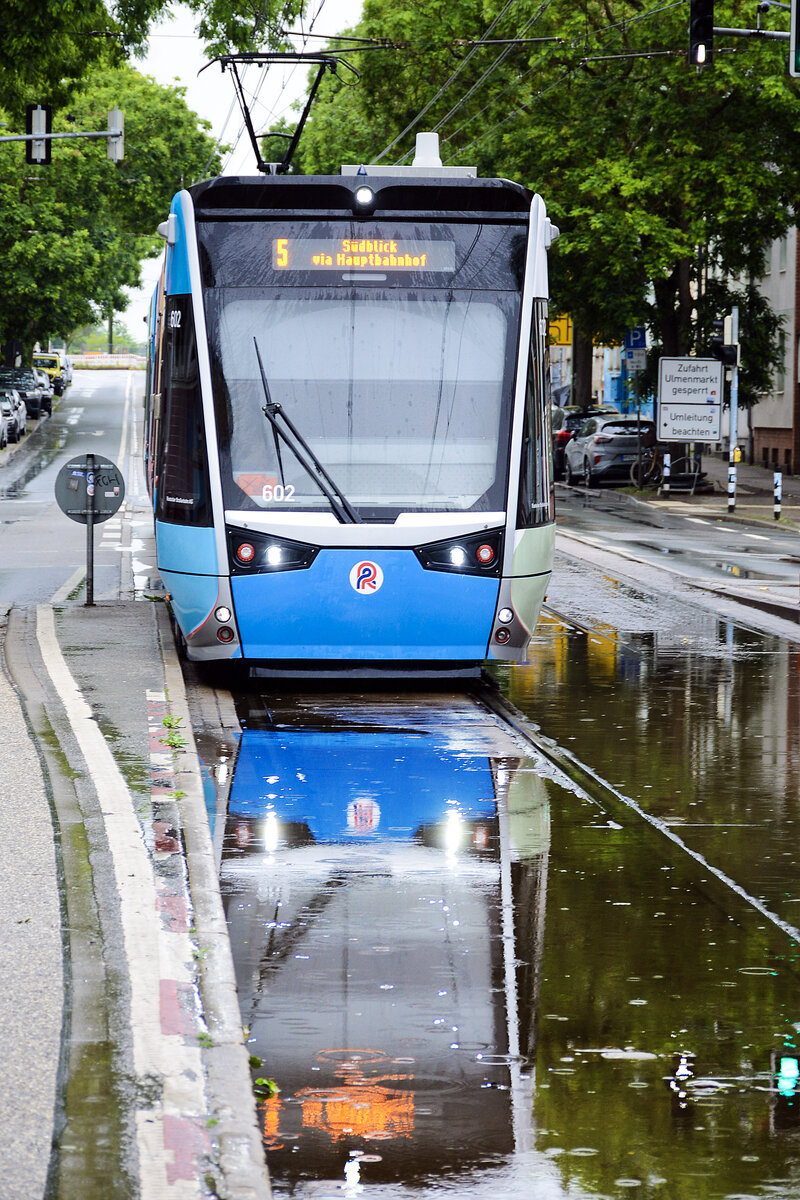 Tram 602 (line 5) belonging to RSAG (Rostocker Straßenbahn AG) at the stop Kabutzenhof in Doberaner Straße in Rostock.