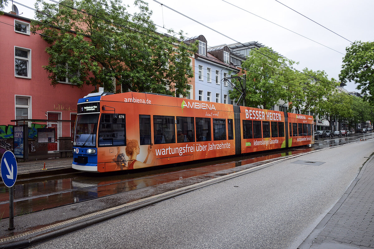 Tram 678 (line1) belonging to RSAG (Rostocker Straßenbahn AG) at the stop Kabutzenhof in Doberaner Straße in Rostock.