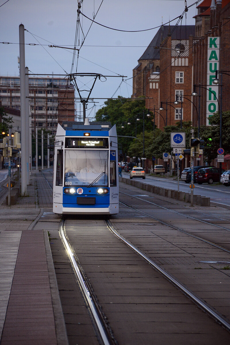 Tram 680 belonging to the company RSAG (Rostocker Straßenbahn AG) on line 1 in Lange Straße in Rostock. Date: 7th June 2025.