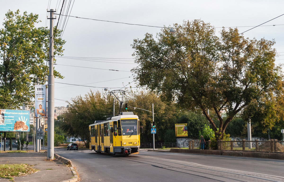 01.09.2024. Ex-Berlin tram Tatra KT4DM No 1206 on Mykolaychuk Street. The end station of the route 6 is located behind the trees, but the tram line is planned to be extended soon