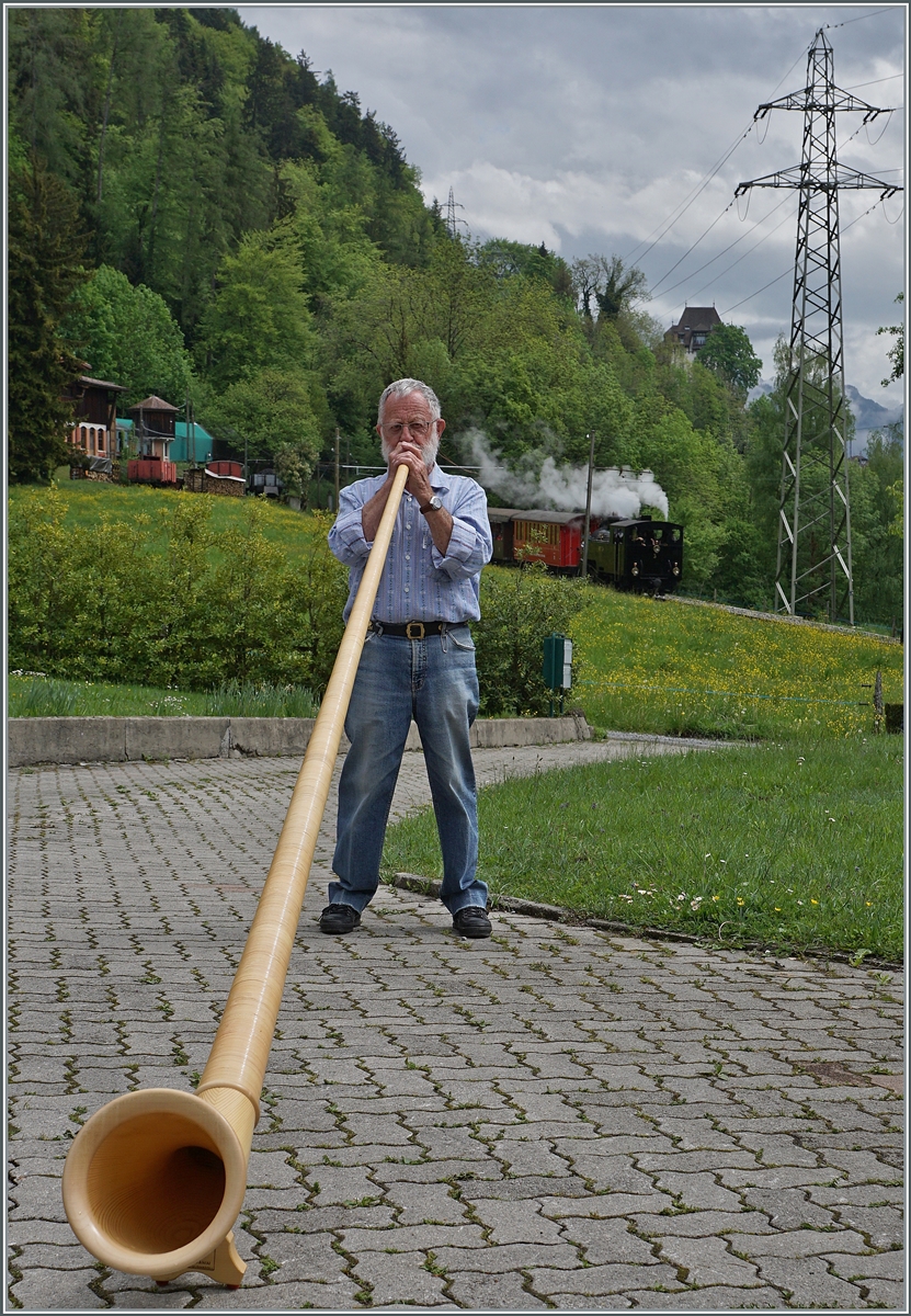 A somewhat different picture for the Blonay-Chamby Railway's season opening: While the BFD HG 3/4 No. 3 steams its train past Chaulin toward Blonay in the background, the magnificent sounds of the alphorn resonate in the foreground.