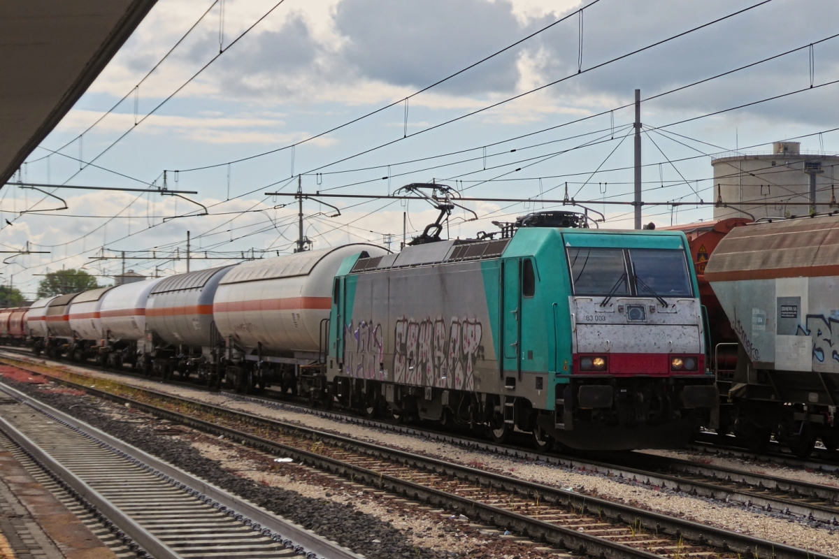 Akiem locomotive 483 308 waiting at the train station from Rovigo for onward travel with its freight train. May 8th, 2025