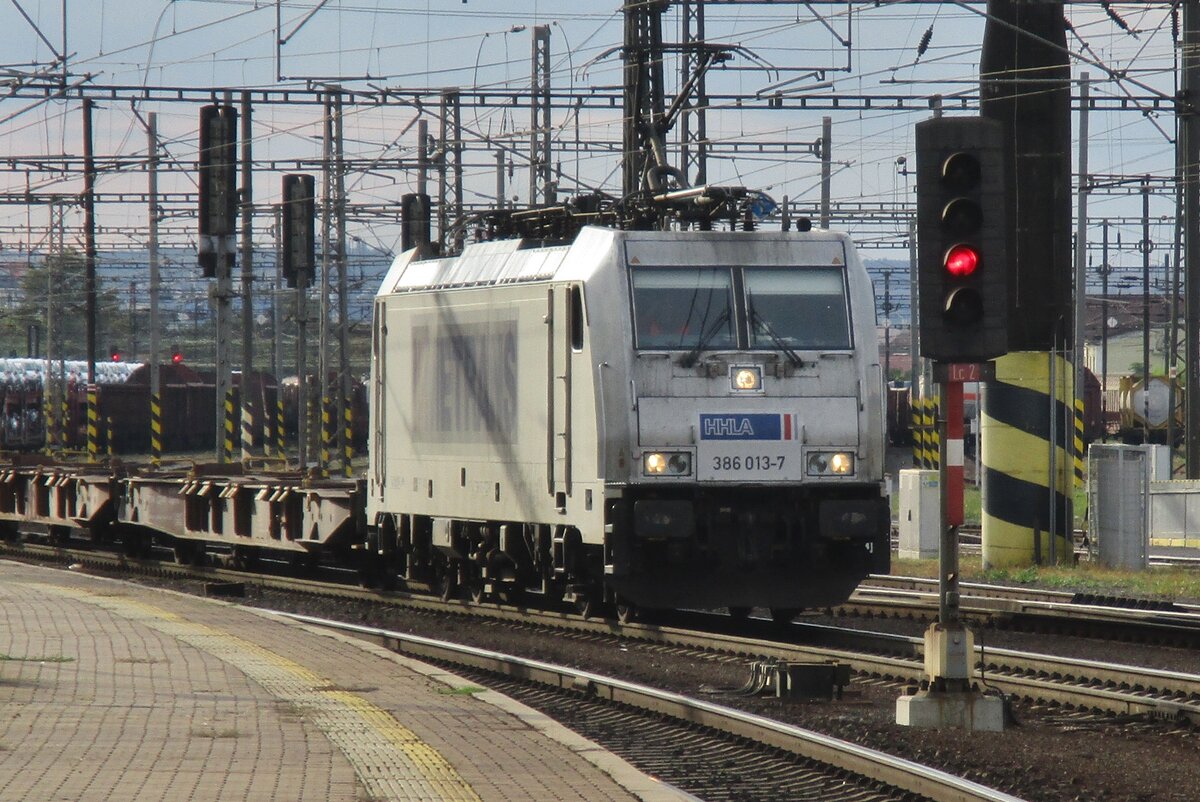 On 17 September 2017, a badly loaded Metrans container train with 386 013 gets the go-ahead at Praha-Liben toward Ceska Trebova.