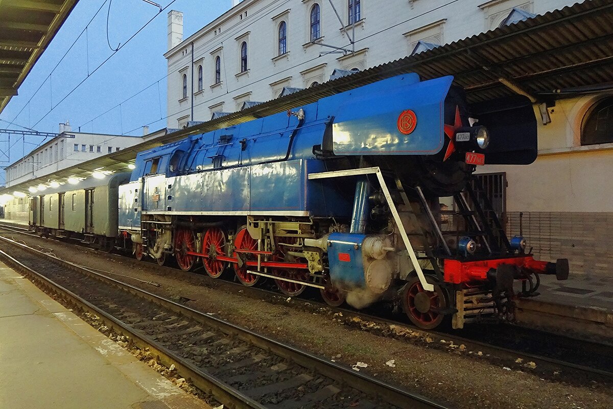 On 20 September 2020 the Sun sets at Praha-Masarykovo wshilst Papousek 477 043 plus one postal van stands at the station's platform.