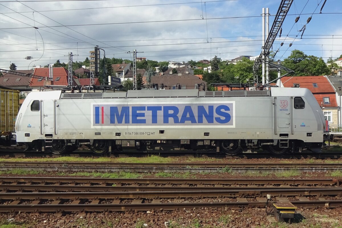On the evening of 7 April 2018 Metrans 386 014 hauls a container train through Pirna toward Ceska Trebova.