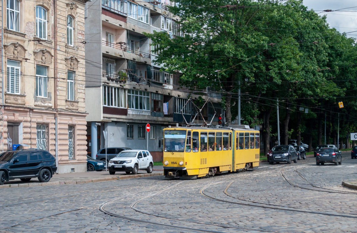 Tatra KT4D tram No.1154 turns from Dmytro Vitovskoho Street to Akademika Sakharova Street. Taken on August 1, 2023.