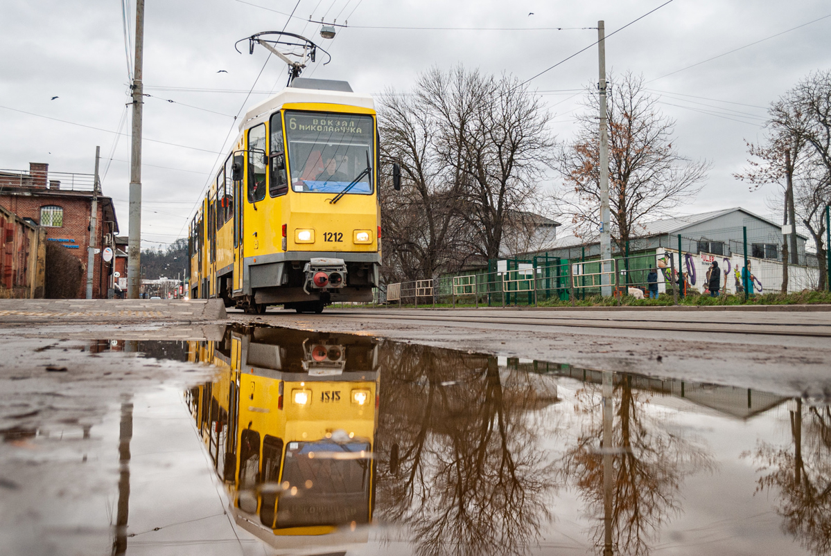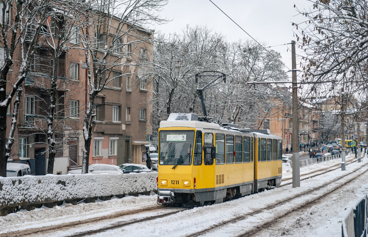 Tatra tram KT4DM No.1211 (route 3) on Akademika Andriy Sakharov Street. The electronic board mistakenly displays route 1, so a plate was placed over it. Taken on November 29, 2023.