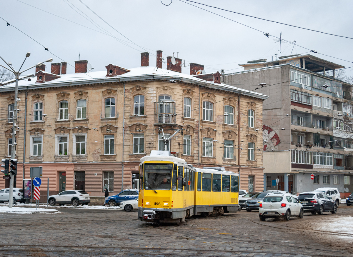 Tatra KT4DM tram No.1196 turns from Dmytro Vitovskoho Street to Akademika Sakharova Street. Taken on November 29, 2023.