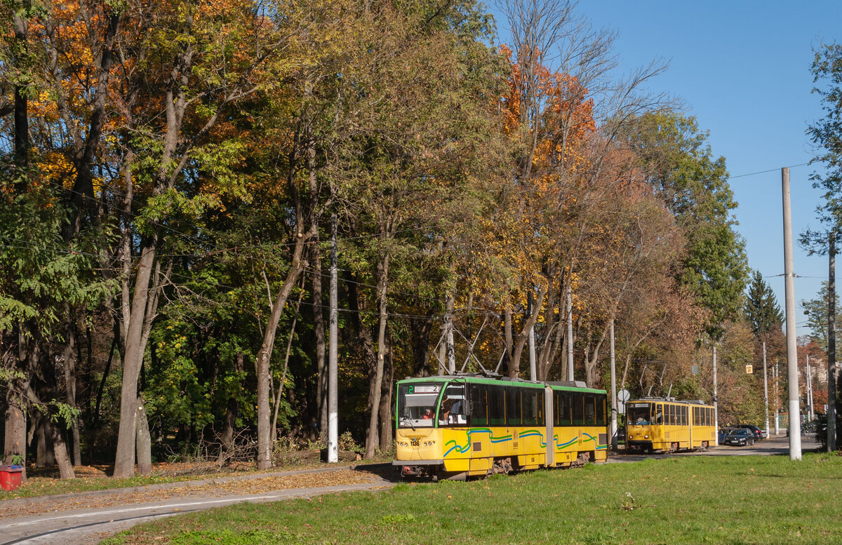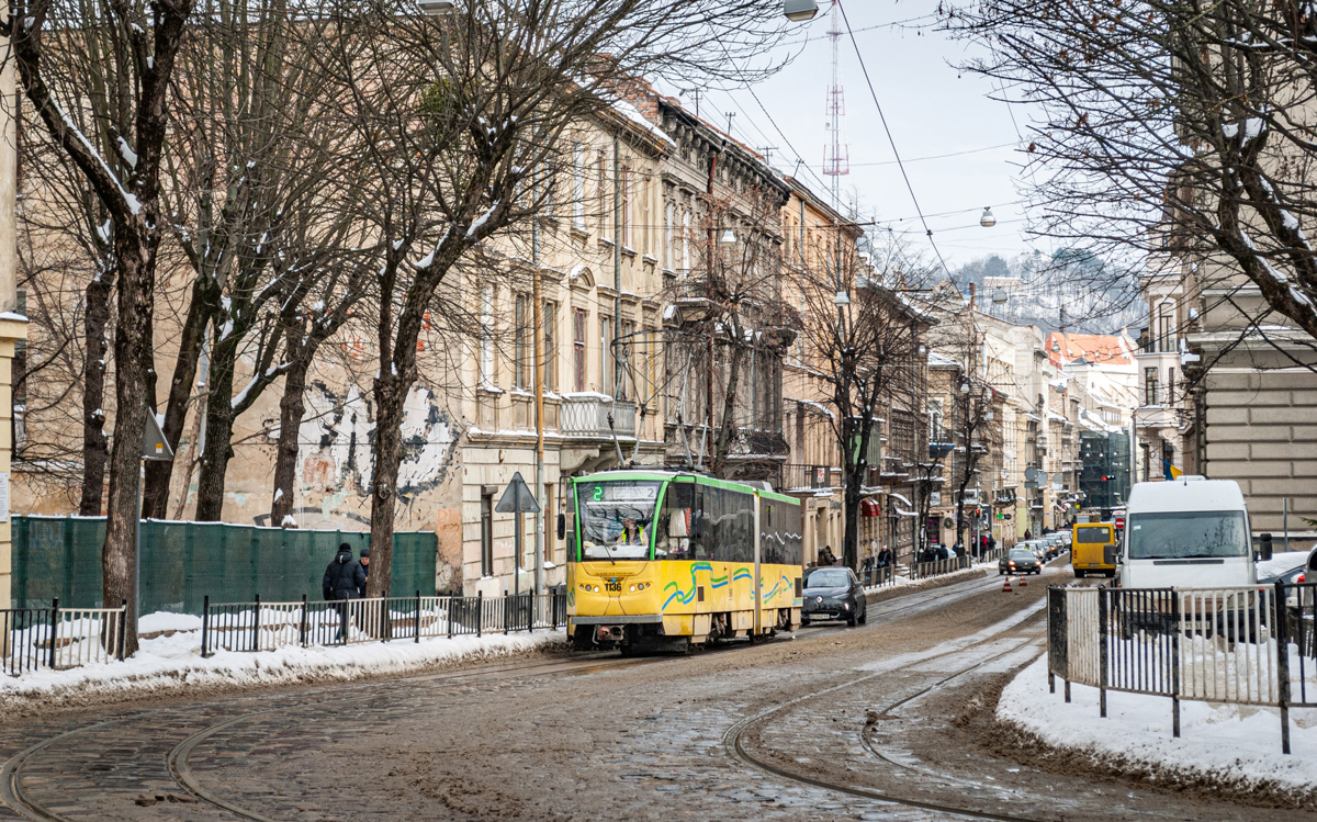 Tatra tram KT4SU 1136 on route 2. Taken on January 15, 2024 on Petro Doroshenko Street.