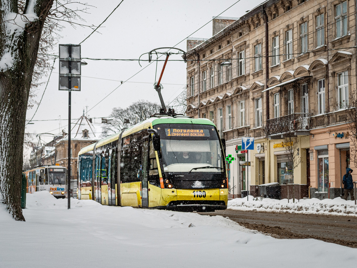 Tram Electron T3L44 1180 on route 1. This is the first short tram produced by Electron in 2014. Taken on January 14, 2024 on Stepan Bandera Street.