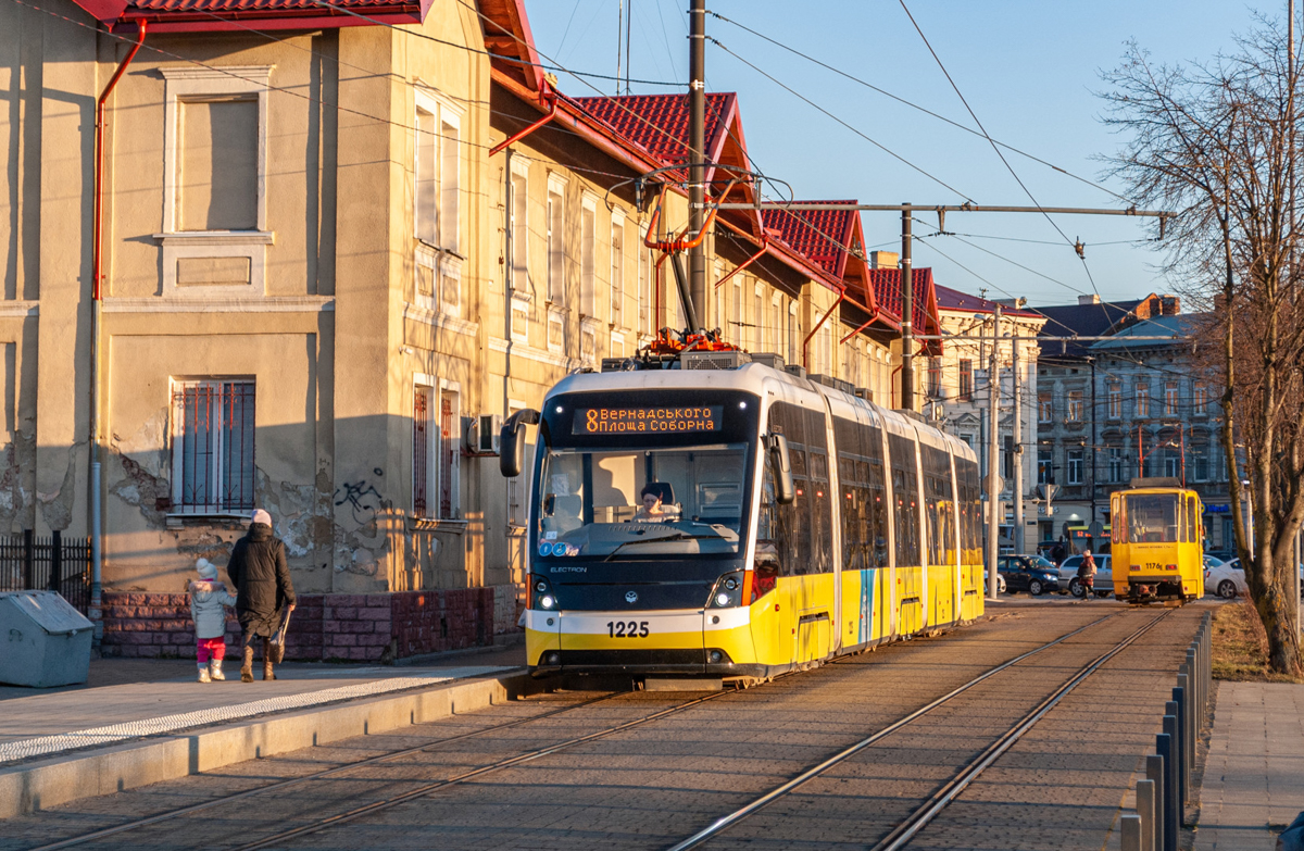 Tram Electron T5L64 No. 1225 had been in operation for only 2 months at the time of the photo. Taken on December 28, 2023 on Chernivetska Street.