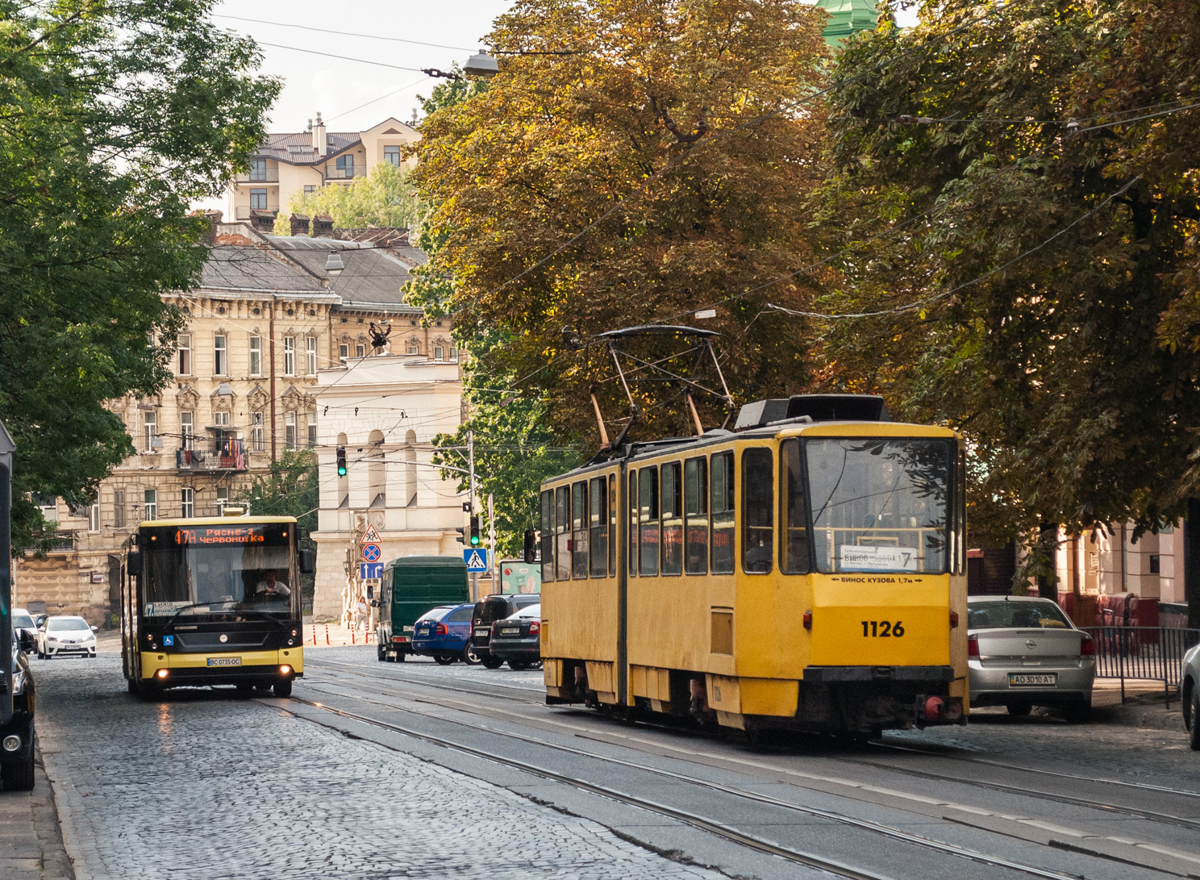 30.08.2024. The Tatra KT4SU tram No 1126 (route 7) on the Lychakivs`ka Street. Nearby you can see an Electron city bus, which is manufactured in Lviv.