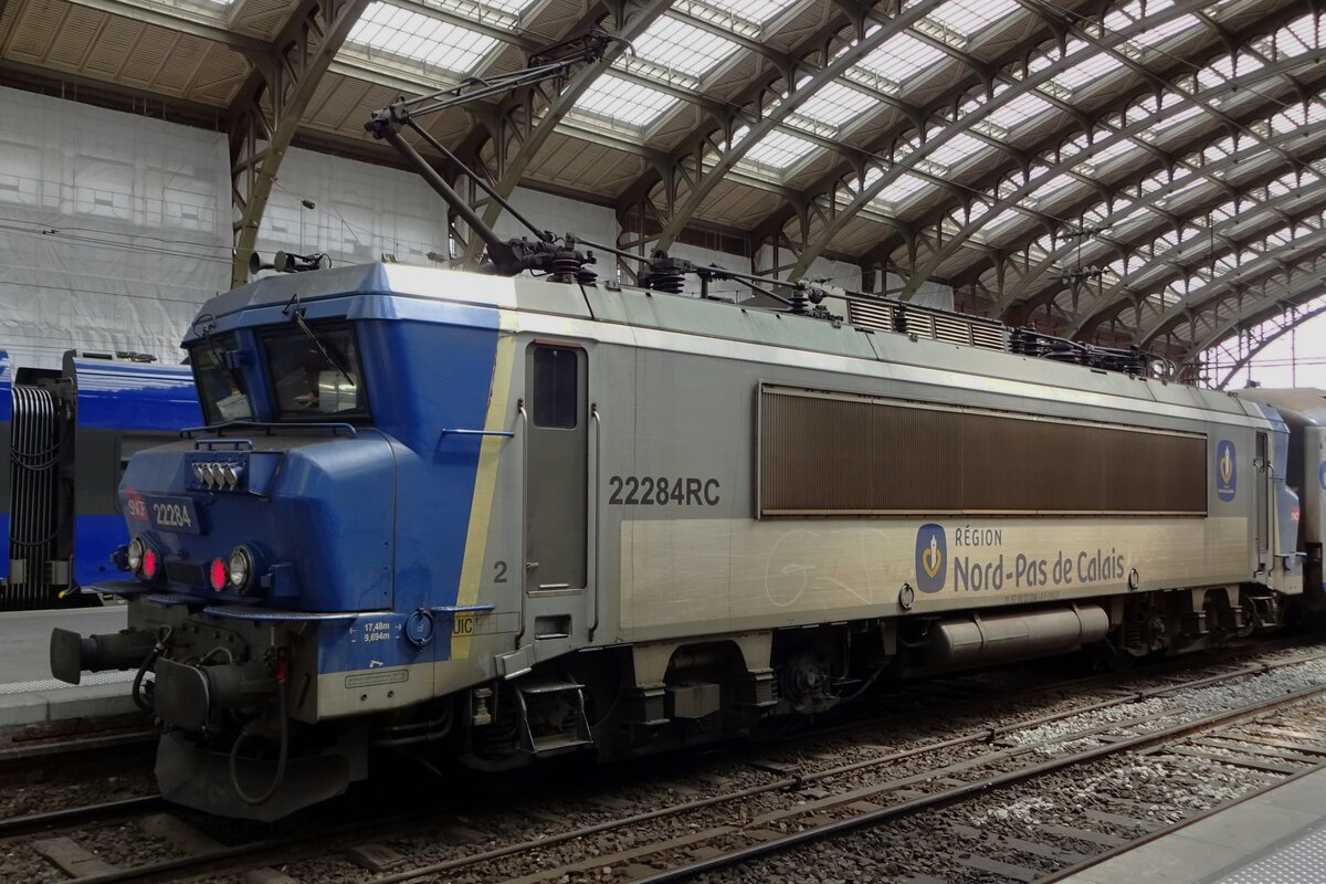 SNCF 22284 stands on 24 May 2019 in Lille-Flandres and sports the Nord-Pas-de-Calais markings. Loco haulage has become extremely rare in NPdC and Picardie (fused into the Hauts-de-FRance Region in 2022), the nez-cassées having been replaced by EMUs and Bi-Modal units now.