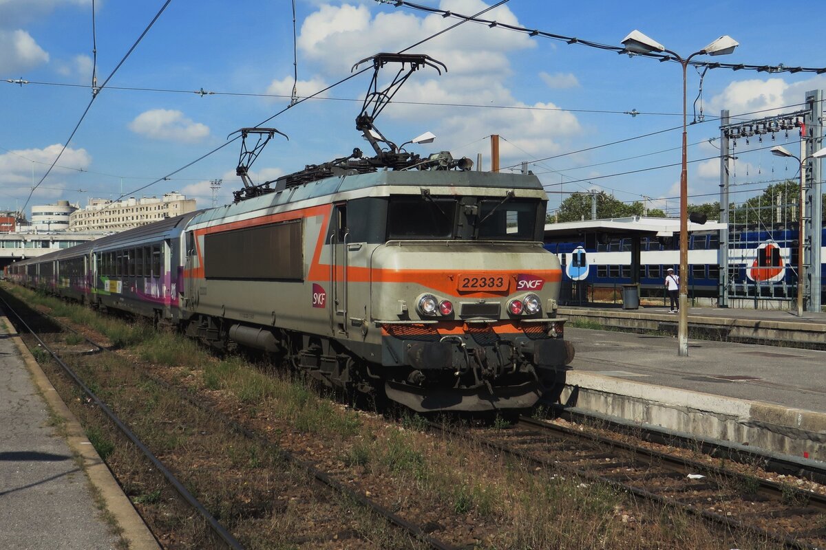 SNCF 22333 awaits departure at Paris-Bercy on 17 September 2021. She wil not depart imediately, since both the DC (front, inwards folding) and AC (back, outward folding) current pantographes have been raised.