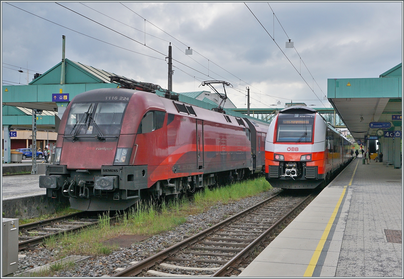 The ÖBB 1116 224 has arrived in Bregenz with its RailJet, while on the adjacent track the ÖBB ET 4748 510-6 is waiting to depart for St Margrethen SG.