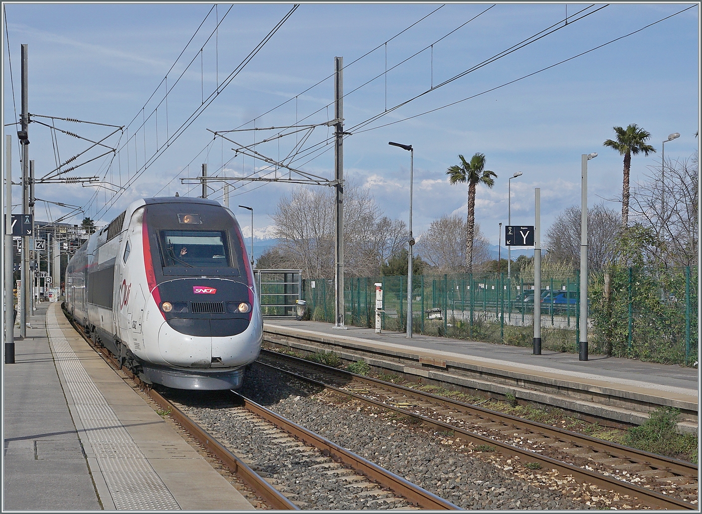 The TGV 9582 from Marseille to Frankfurt by his stop in the Belfort-Montpellier-TGV Station.