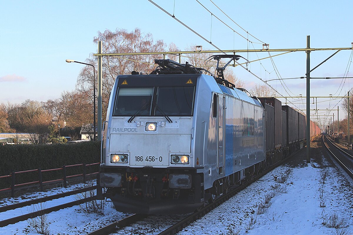 The Sun begins to disappear when on 19 January 2024 Lineas 186 456 hauling the Volvo container train towards Antwerpen passes through Gilze Rijen and gets photographed from the station's platform. Leonardus Schrijvers