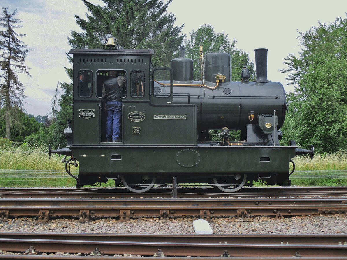 Side view on SHM-26 at Simpelveld on 8 July 2017. This class of locomotives were deployed in the very south of the Netherlands and this engine used to be LTM-26 (Limburgsche Tram Maatschappij) before being rescued by the West-Frisian Stoomtram Hoorn-Medemblik (West-Frisia being the region around Hoorn and Medemblik).