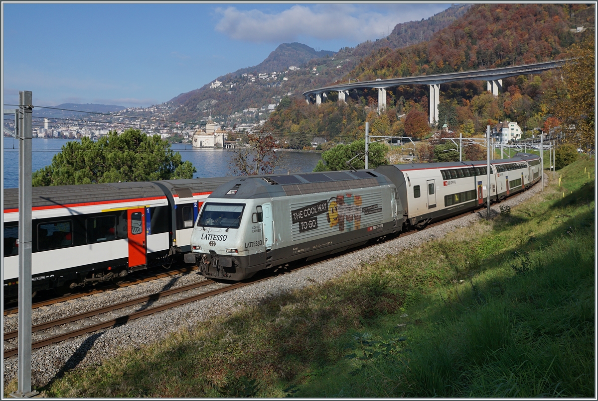 A SBB Re 460 with an IR on the new Rohne Bridge between St-Maurice and Bex.