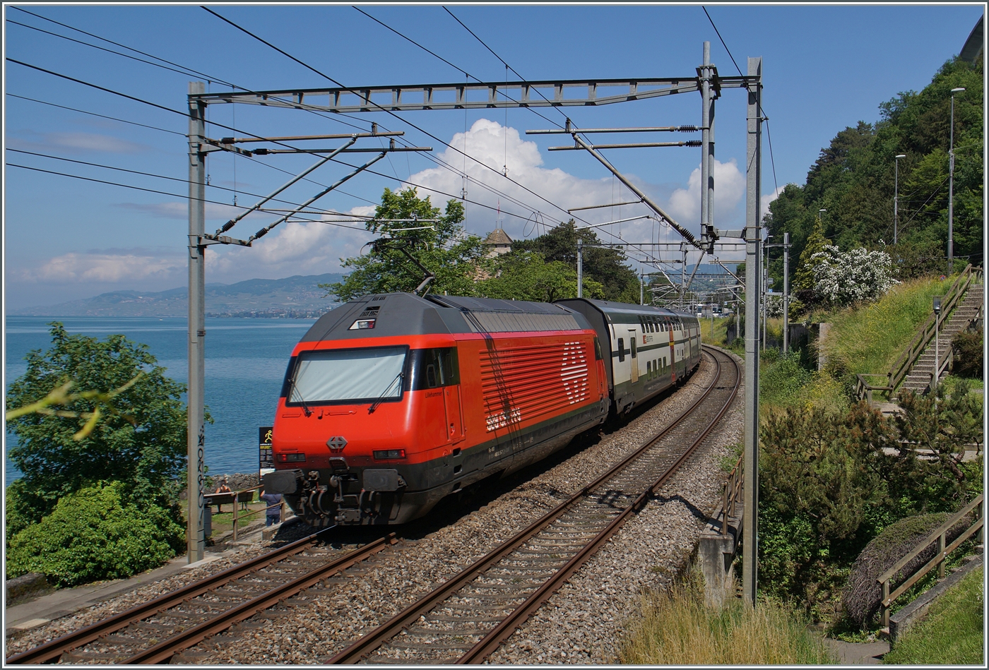 A SBB Re 460 with an IR90 by the Castle of Chillon.