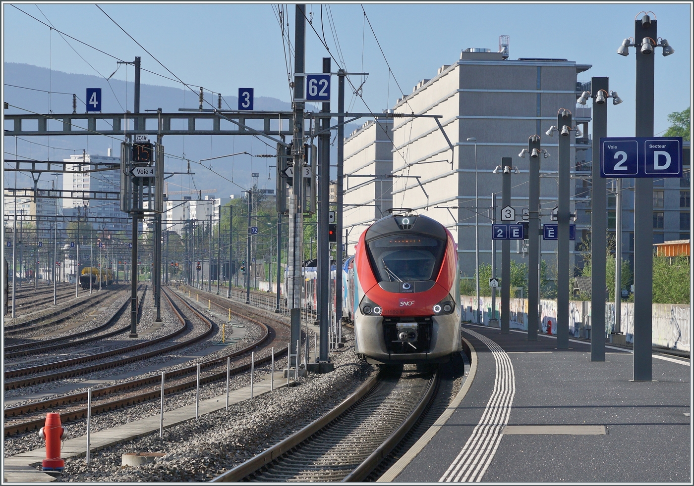The Coradia Polyvalent regional tri-current 31549M is operating as Léman Express RL4 from Coppet to Annemasse and is captured during the stop at Lancy Pont Rouge.