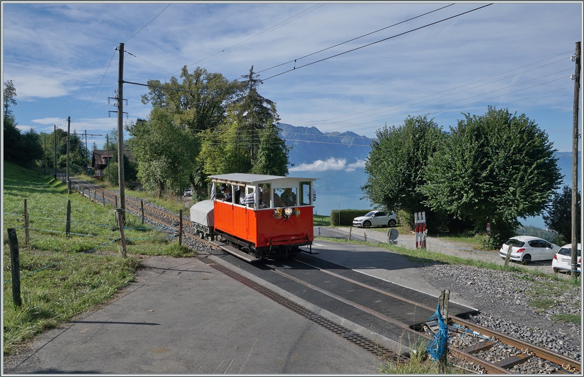 A CEV local train from Les Pleiades to Vevey on the left and a Blonay Chamby train to Chaulin ont the right in Blonay.