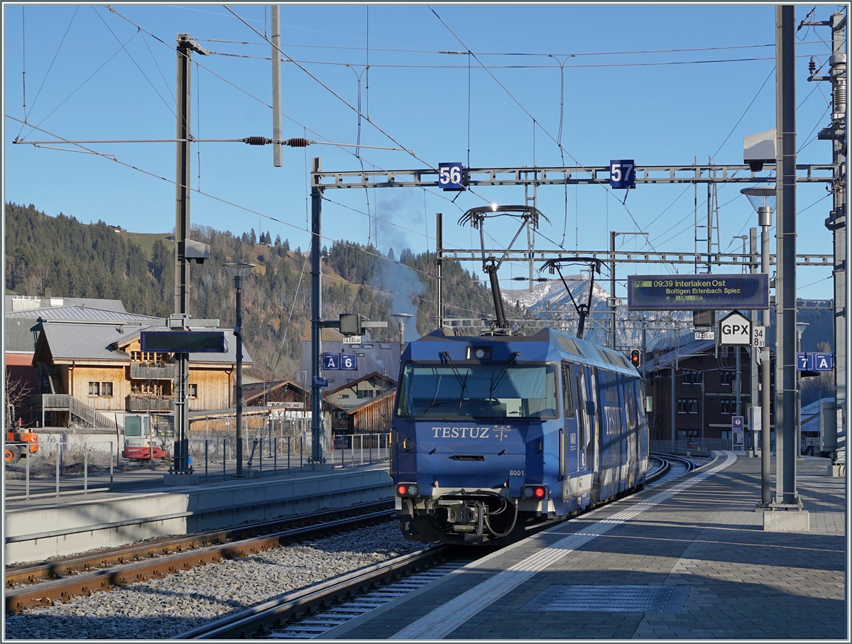 The MOB ABDe 8/8 is arriving with his train 2221 from Zweisimmen to Montreux at Gstaad.