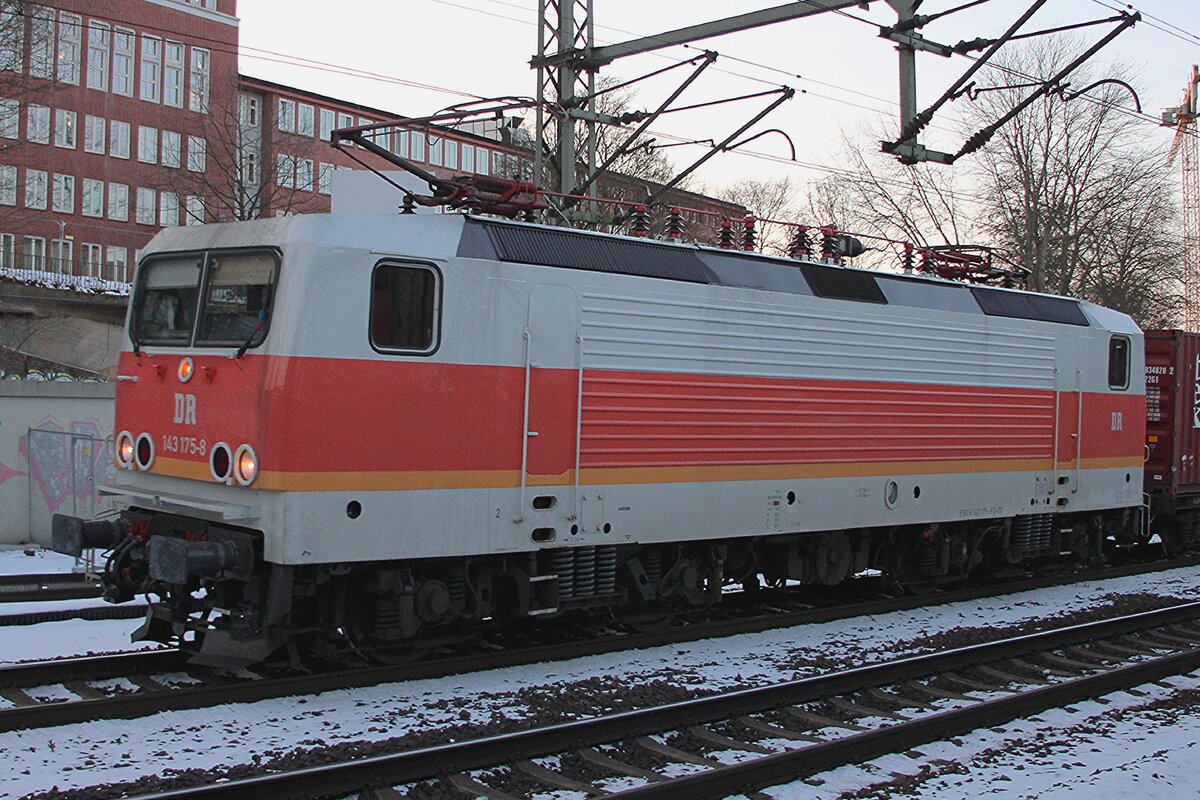 DR, S-Bahn e merci in un colpo solo: Delta Rail utilizza alcune ex locomotive DR 243, DB 143 con verniciature più datate nel traffico merci. Negli ultimi bagliori del crepuscolo del 19 febbraio 2026 la DR 143 175, con una livrea quasi retrò da S-Bahn, passa attraverso Hamburg Harburg con un treno di container. Leonardus Schrijvers